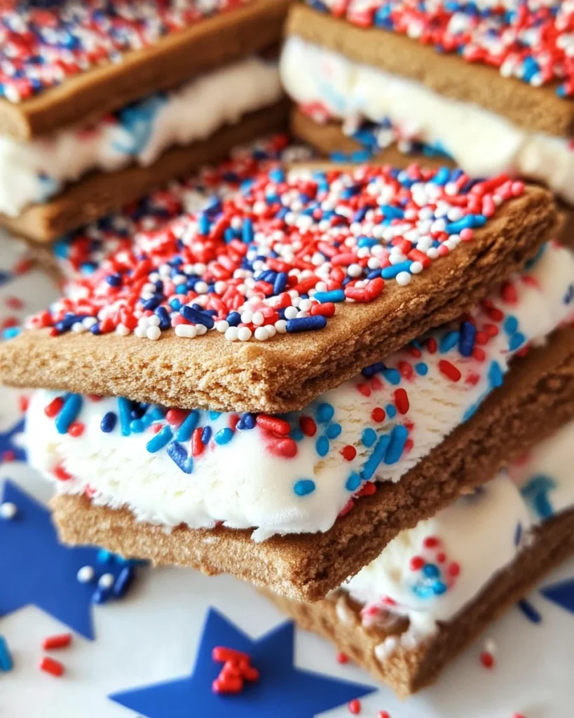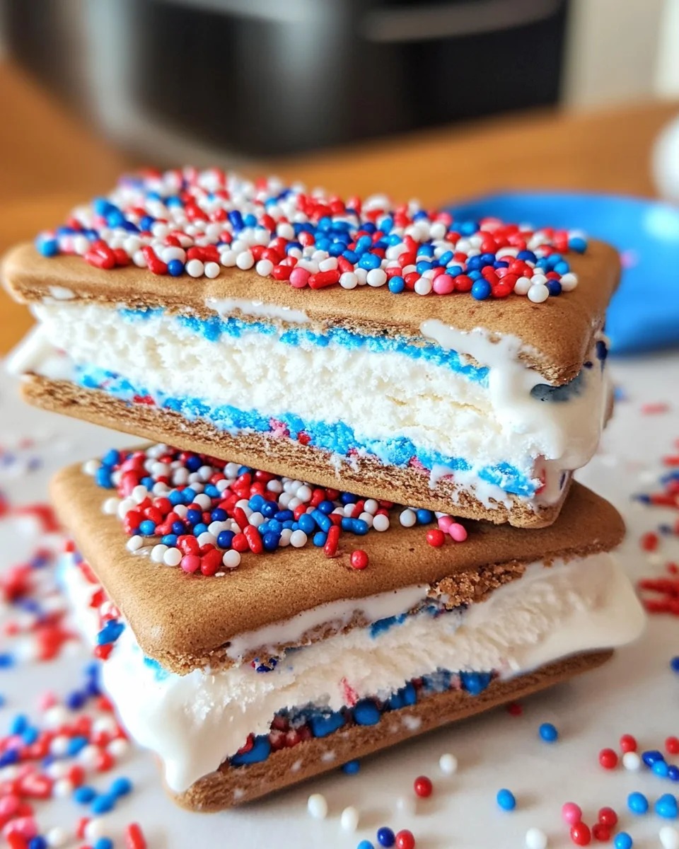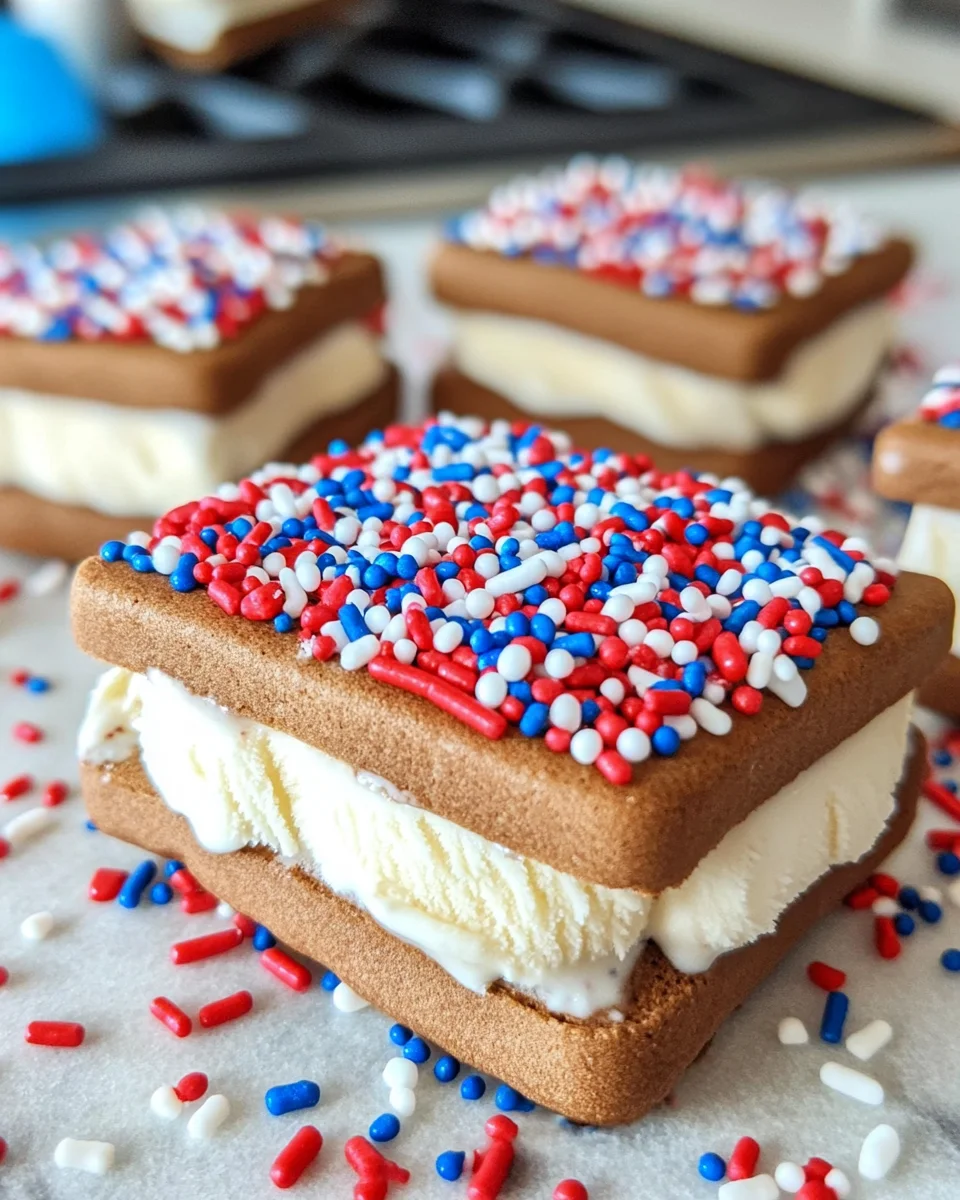 Feel free to get creative! Try using star-shaped sprinkles or even drizzling some melted chocolate on top for an extra touch of flair. Your 4th of July Ice Cream Sandwiches are sure to impress family and friends!