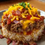 A delicious layered rice dish featuring ground beef, bacon, and cheese, perfect for a hearty meal.