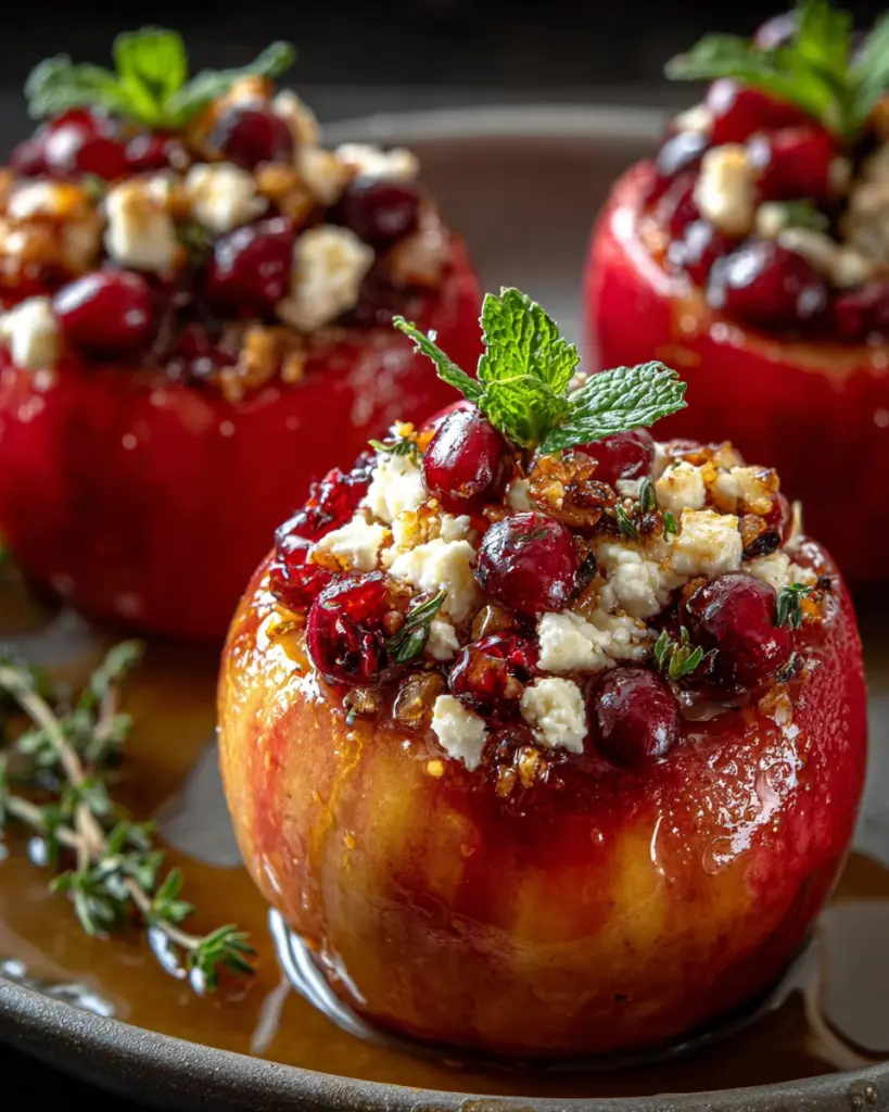 Baked Apples Feta Honey Cranberries is a delightful dessert featuring tender baked apples stuffed with a sweet and savory filling of feta cheese, cranberries, and spices.