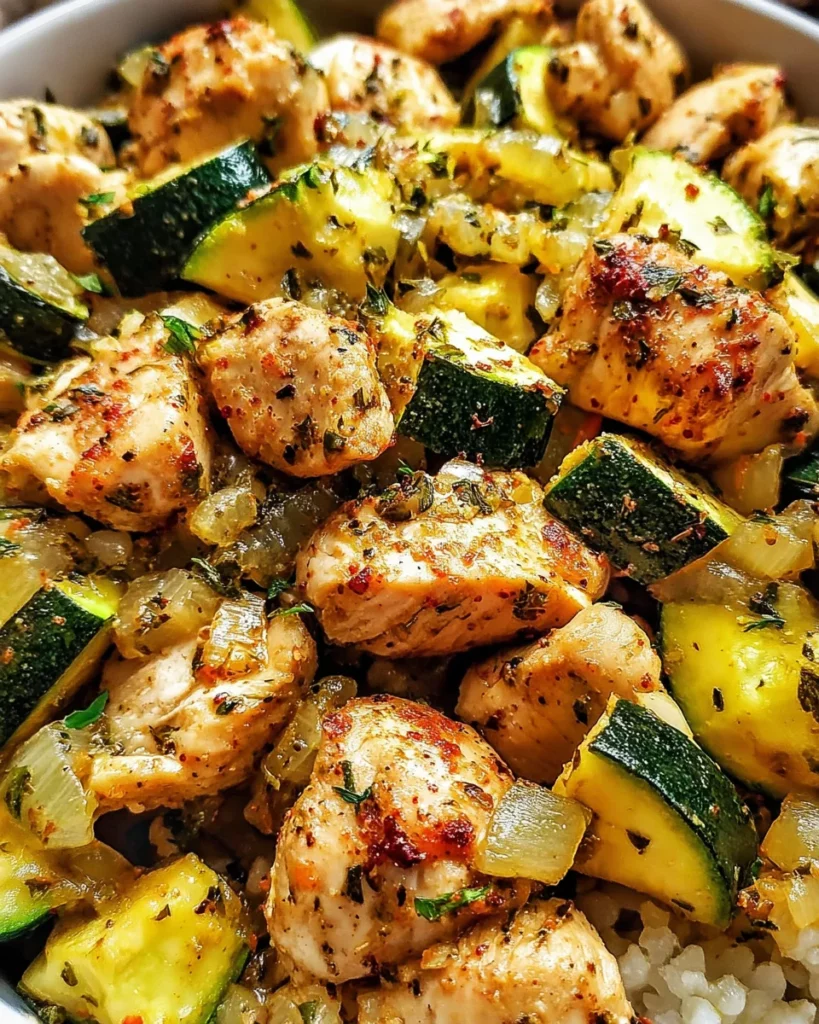 A quick and delicious one-pan meal featuring baked chicken and zucchini.