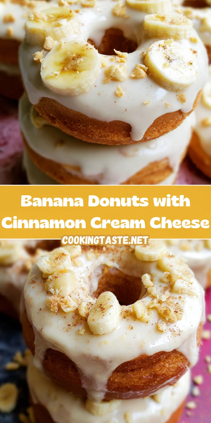 Deliciously fluffy banana donuts topped with a creamy cinnamon cream cheese frosting, perfect for any dessert lover!