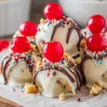 Return the coated truffles to the parchment paper. It’s time for the finishing touches! Melt the chocolate wafers similarly and drizzle a small dollop over each truffle. Add a stemmed maraschino cherry on top, and sprinkle with rainbow sprinkles for that festive flair. They’ll look like tiny desserts fit for a celebration. Finally, let them chill again for an additional 30 minutes before serving. You’ll be excited to share these with everyone!