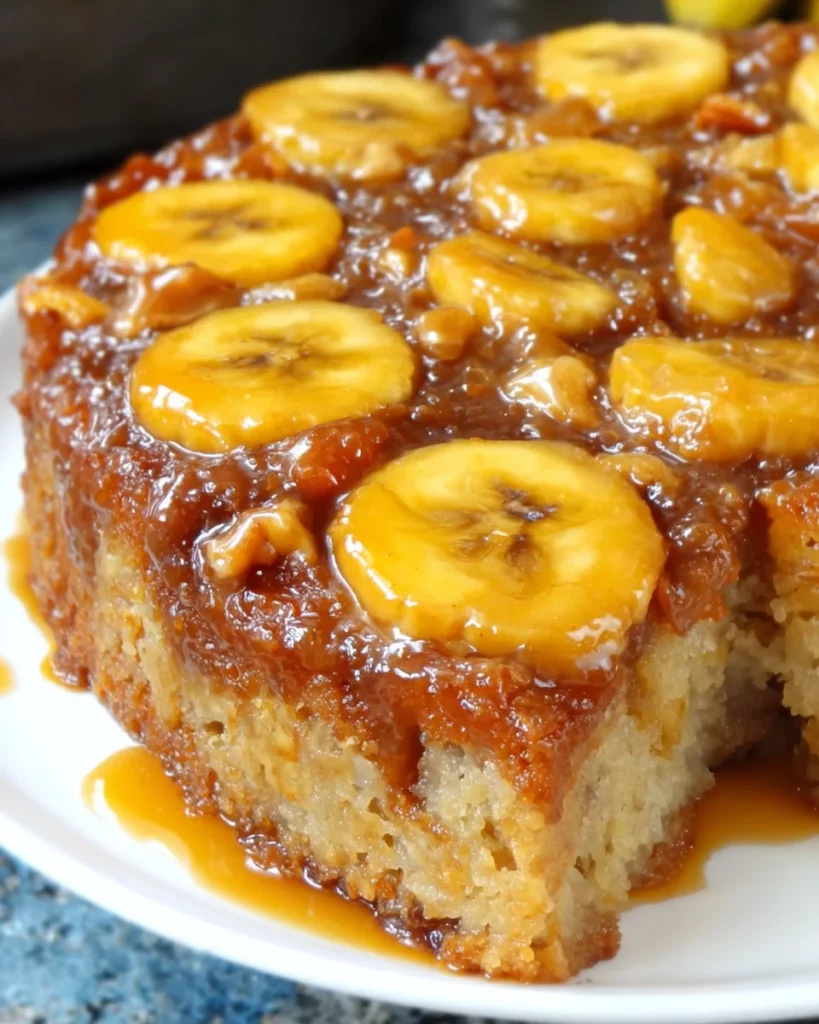 Banana Upside Down Cake is a delicious and moist dessert featuring caramelized bananas atop a fluffy cake.