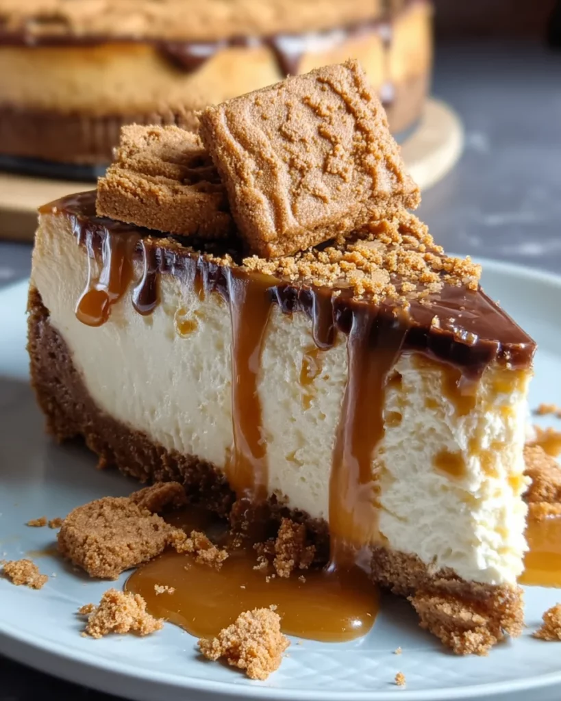 A delicious cheesecake with a Biscoff cookie crust, topped with melted Biscoff cookie butter and crushed cookies.