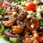 A delicious Blackened Shrimp Salad topped with a tangy Feta Vinaigrette.