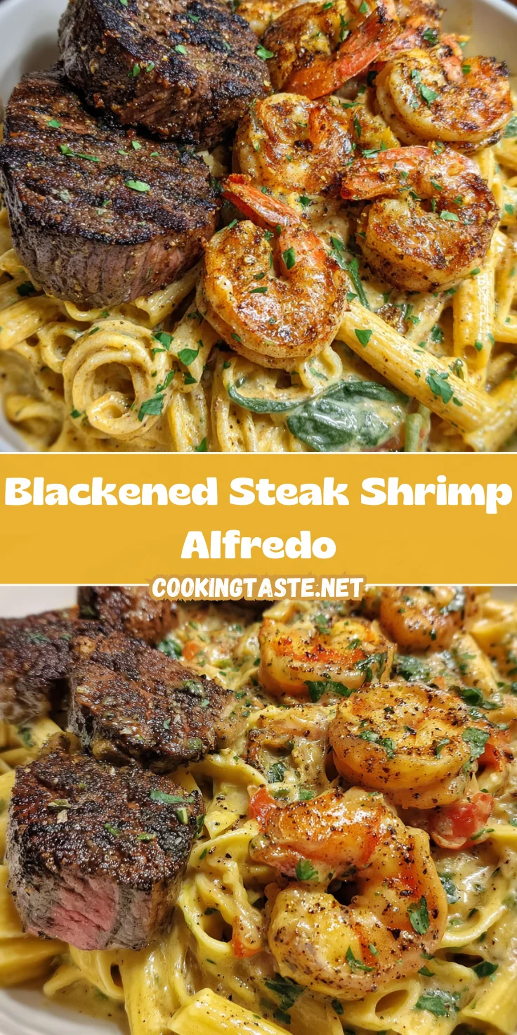 A delicious and creamy pasta dish featuring blackened steak and shrimp, creating the perfect flavor combination.