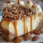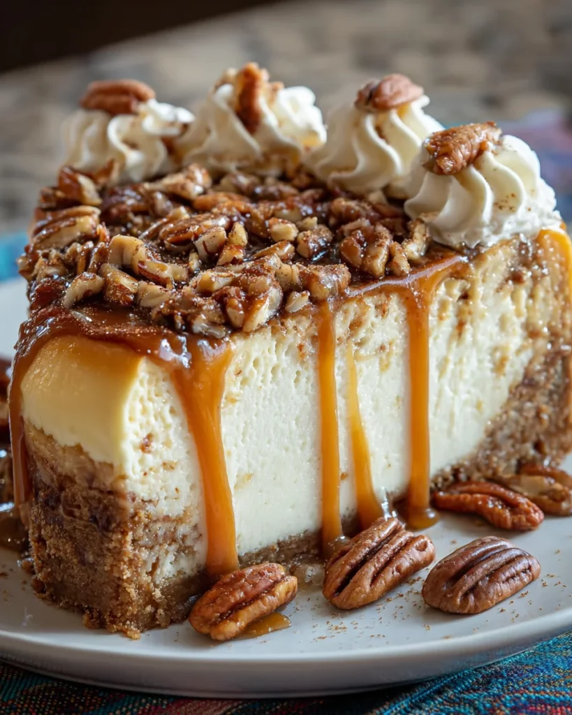 Now for the final touch! Pipe the cinnamon whipped cream on top of your cheesecake. For an extra pop, sprinkle any remaining toasted pecans over the cream and drizzle with caramel sauce. This is where you can really get creative with presentation. Slice it up, serve it chilled, and watch your loved ones dig in with smiles!