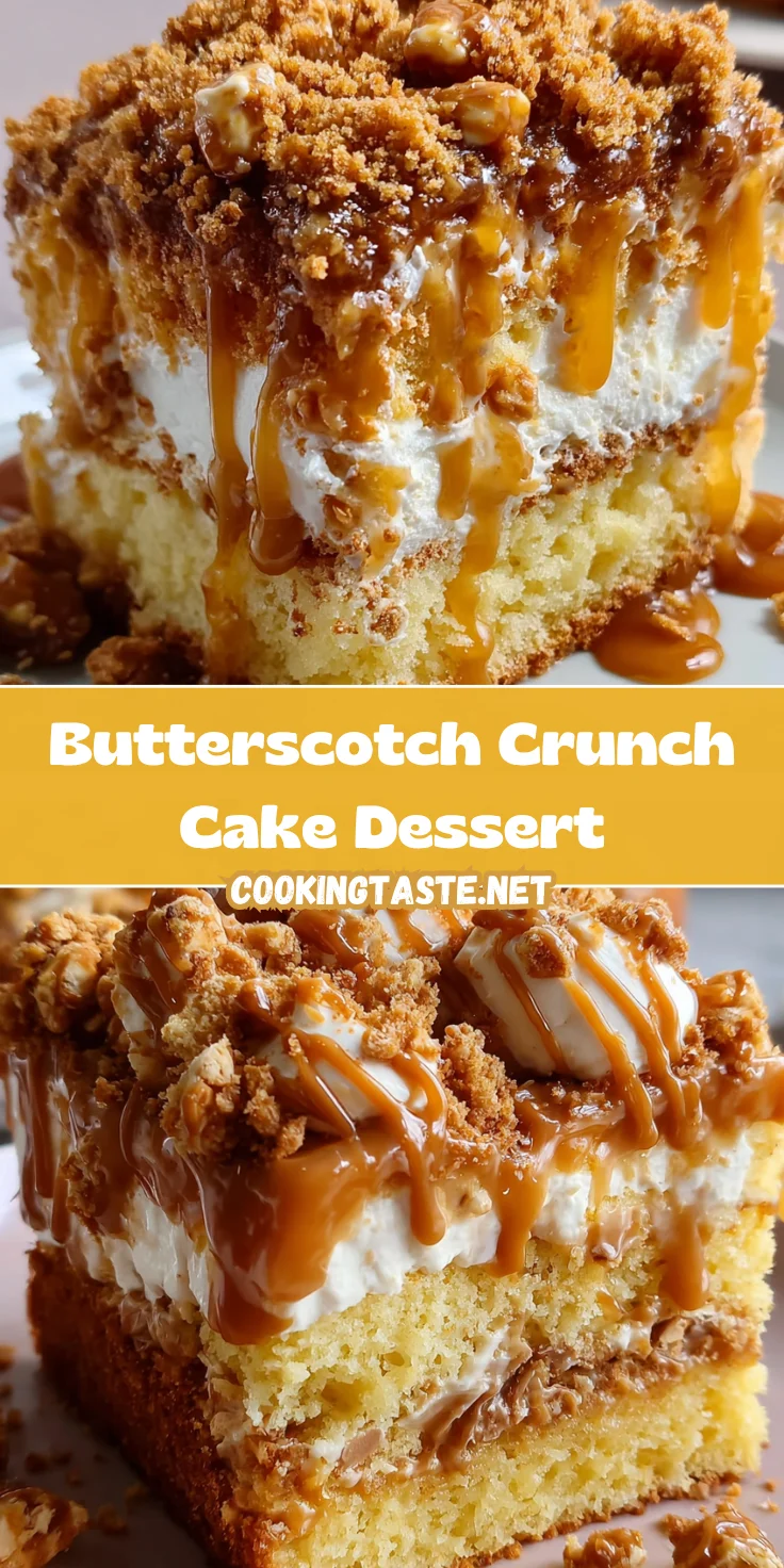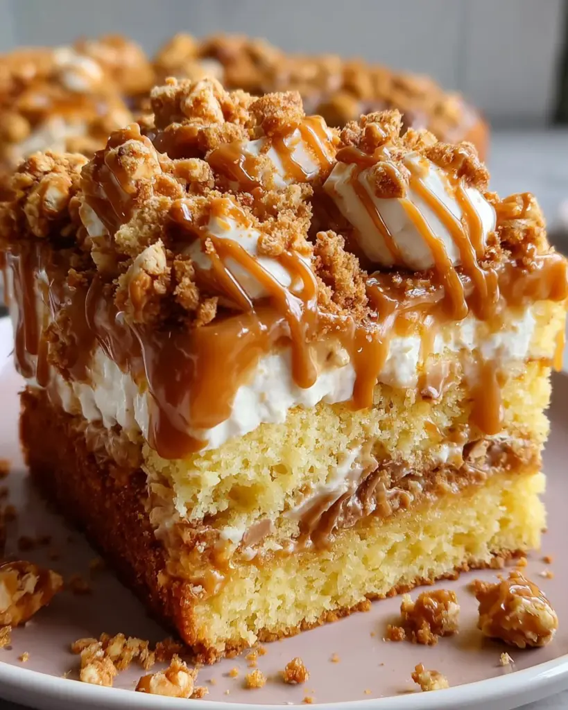 A delicious and irresistible Butterscotch Crunch Cake Dessert that combines a moist yellow cake base with a rich butterscotch glaze and a crunchy topping.