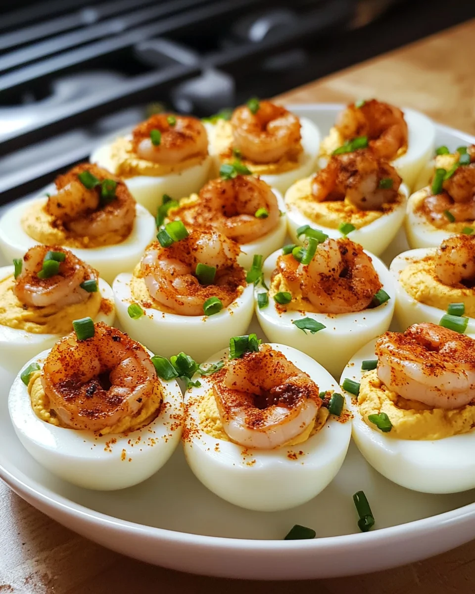 Once chilled, snip a corner of the bag and pipe the filling into each egg white half. Top each one with a perfectly seared shrimp and a sprinkle of green onions or extra Cajun seasoning for that wow factor!