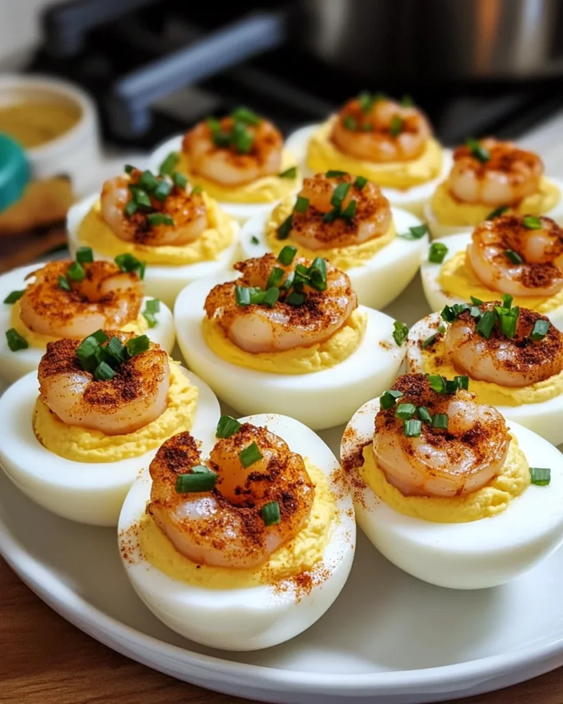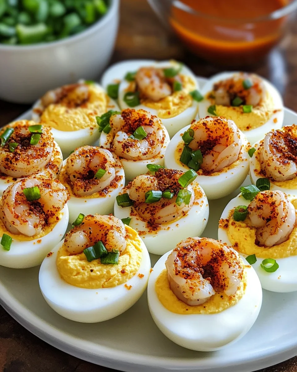 - Pipe the filling into the egg white halves. Garnish with green onions or Cajun seasoning and top each with a seared shrimp.