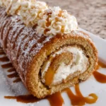 A delightful dessert featuring a moist cake rolled with a creamy filling, topped with caramel for a delicious finish.
