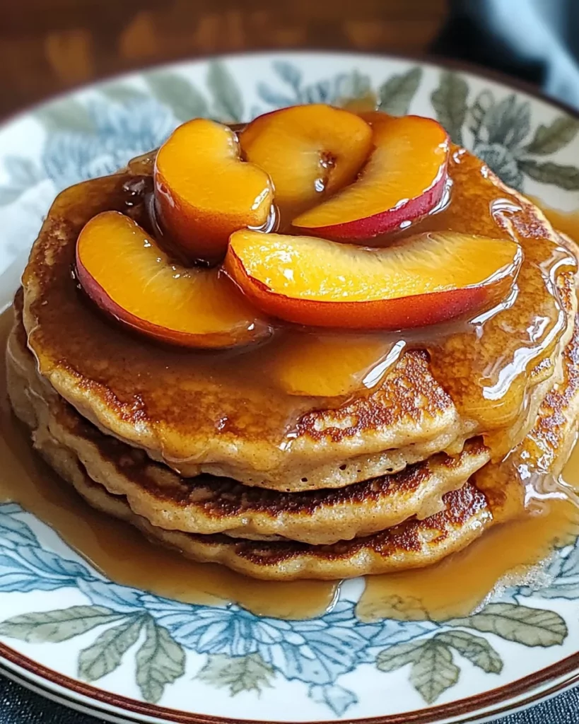 Caramel Peach Upside-Down Pancakes are a delightful breakfast treat featuring a sweet caramelized peach topping over fluffy pancakes.