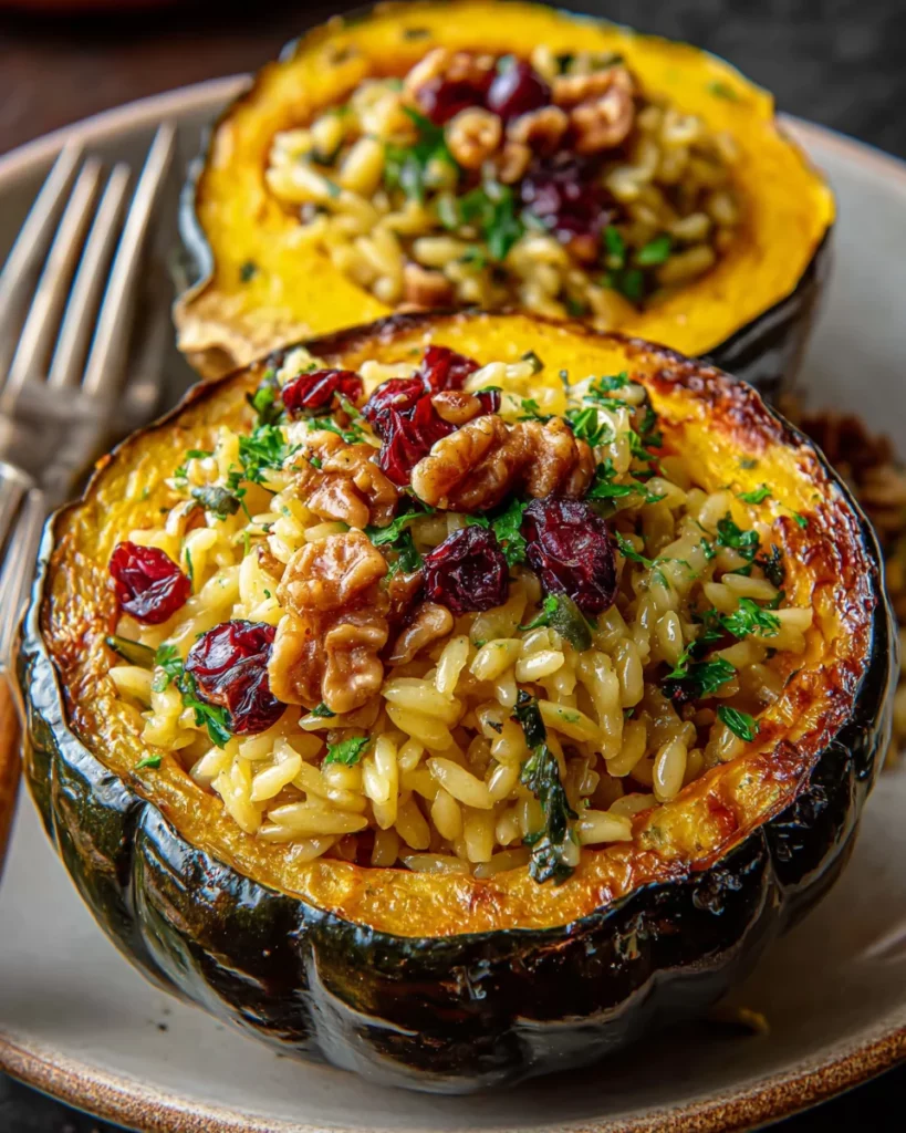 A deliciously unique dish featuring roasted acorn squash stuffed with a savory pumpkin orzo filling and topped with a sweet cherry glaze.