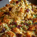 A comforting and flavorful casserole combining Thanksgiving turkey and orzo pasta, layered with stuffing and cranberry sauce.