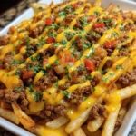 Now, it’s time to assemble! Arrange those crispy french fries over the beef, crowning it with shredded sharp cheddar cheese. It’s a cheesy masterpiece in the making!