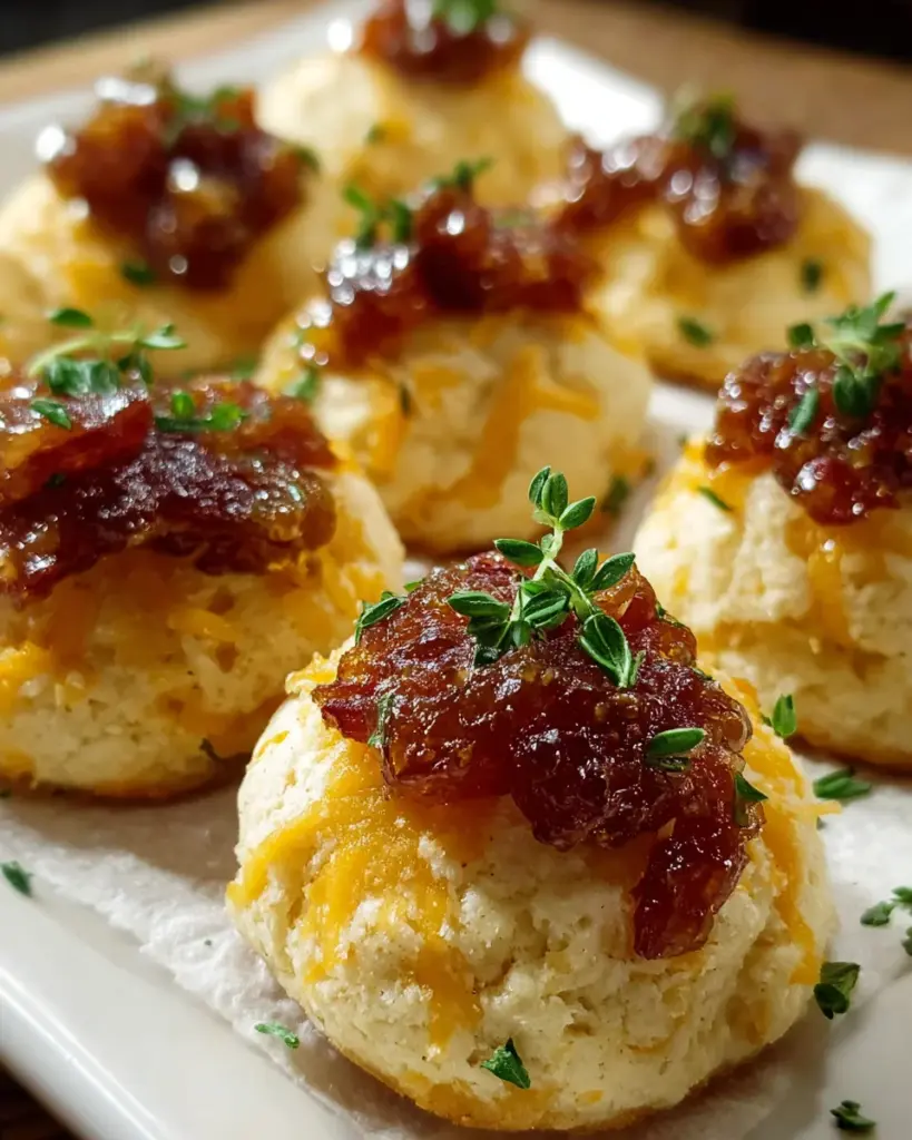A delightful appetizer featuring cheesy dough filled with savory onion bacon jam.