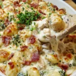 A comforting dish of chicken, gnocchi, and broccoli, baked with creamy Alfredo sauce and topped with melted cheese.