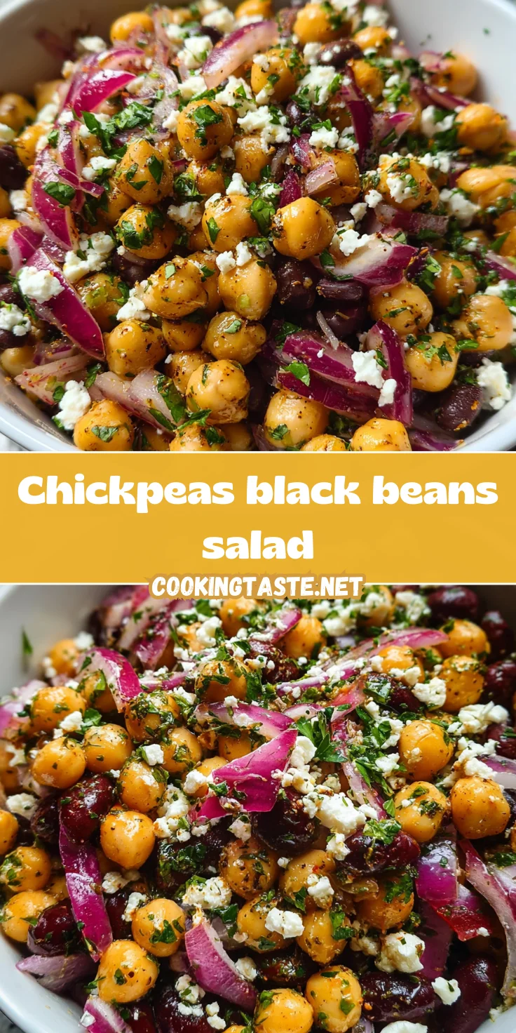 A refreshing and colorful salad made with chickpeas and black beans, enhanced with a zesty dressing and fresh toppings.