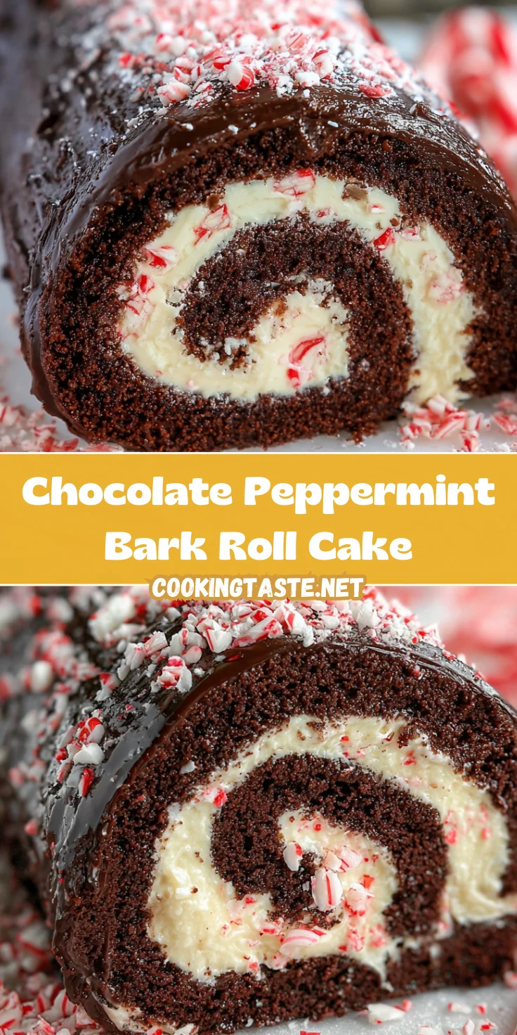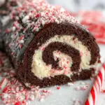 A delightful chocolate peppermint bark roll cake perfect for festive celebrations, featuring a rich chocolate cake filled with a creamy white chocolate peppermint filling, topped with a smooth ganache and crushed candy canes.