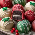 Indulge in a festive treat with these delicious Christmas Oreo Balls, featuring a mix of regular and red velvet Oreos coated in colorful candy melts.