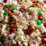 A festive and fun treat made with popcorn, candy, pretzels, and M&Ms, perfect for Christmas celebrations.