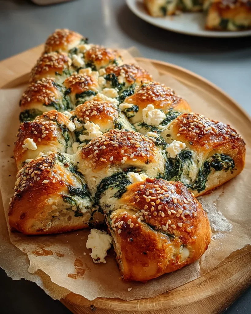 A festive and delicious bread shaped like a Christmas tree, filled with spinach and feta. Perfect for holiday gatherings!