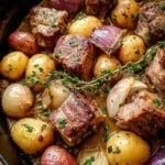 Return the seared pork to the pot, nestling it among the sautéed onions and garlic. Now, grab those halved red potatoes and arrange them around the pork. It looks so inviting already, doesn’t it?
