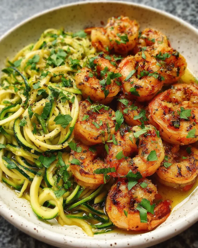 A refreshing and flavorful dish featuring grilled shrimp served on a bed of zucchini noodles tossed in a citrus marinade.