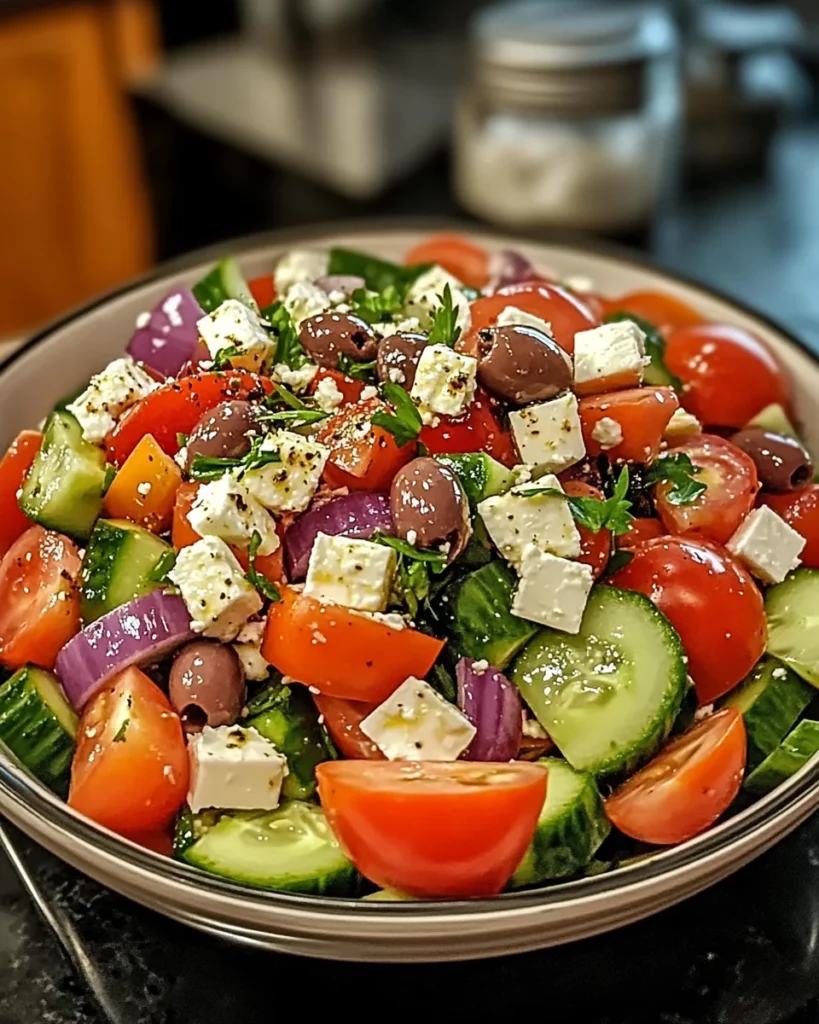 Finally, serve your Classic Greek Salad immediately. For a special touch, you can garnish it with fresh parsley. This salad is best enjoyed fresh, but if you need to chill it briefly before serving, that’s okay too! Bon appétit!