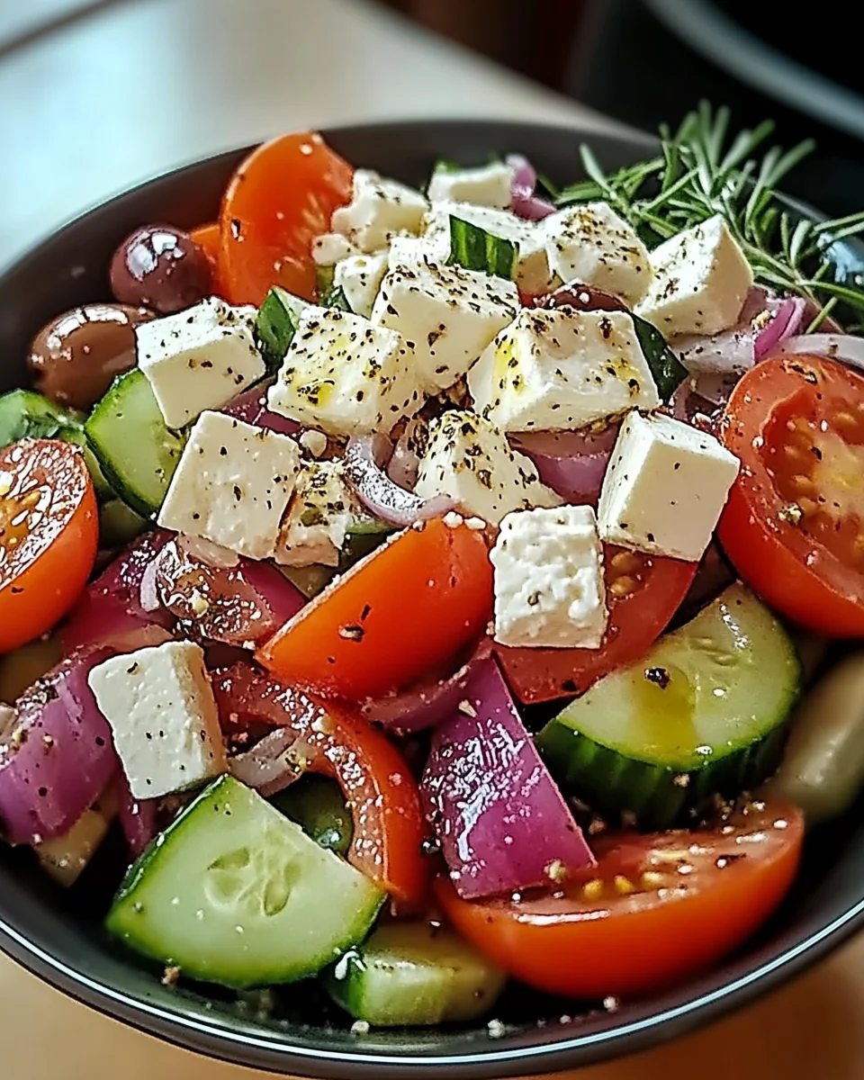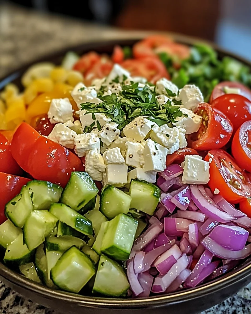 Creating a Classic Greek Salad is as easy as pie—no baking required! Let’s jump into the joyful process of assembling this refreshing dish. Follow these simple steps to bring a taste of Greece to your table.