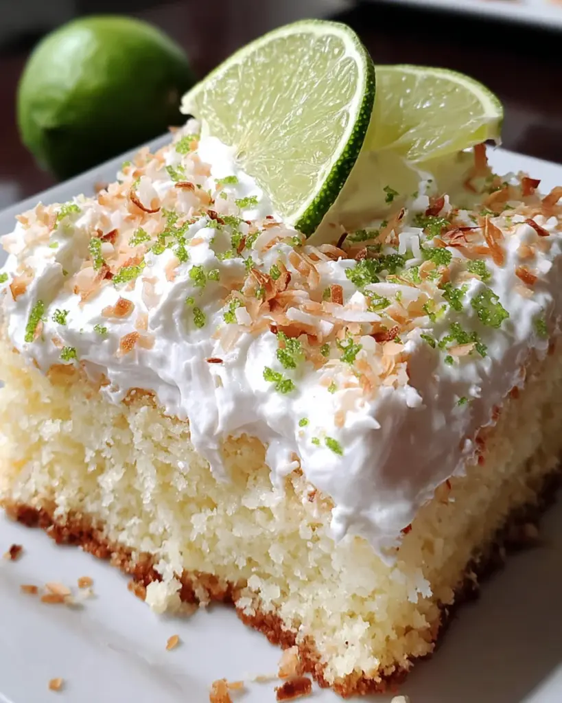 A delicious and refreshing coconut lime poke cake topped with whipped cream and toasted coconut flakes.