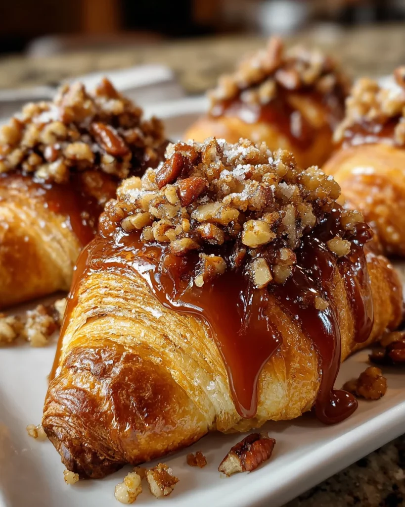 Delicious mini croissants filled with cookie dough and topped with pecans and caramel sauce, perfect for Thanksgiving.