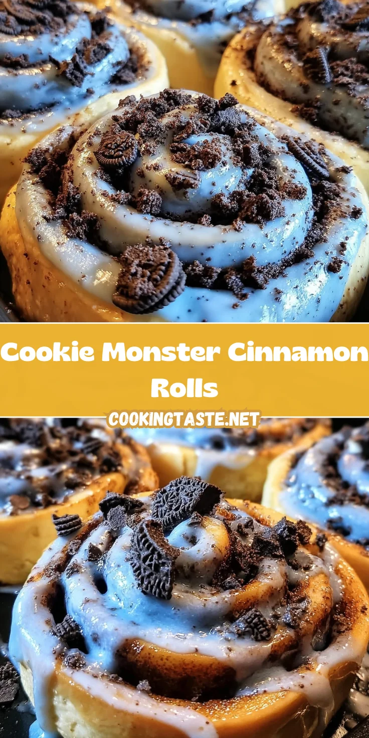 Delicious cinnamon rolls with a fun Cookie Monster twist, featuring blue dough and cookie-filled filling.