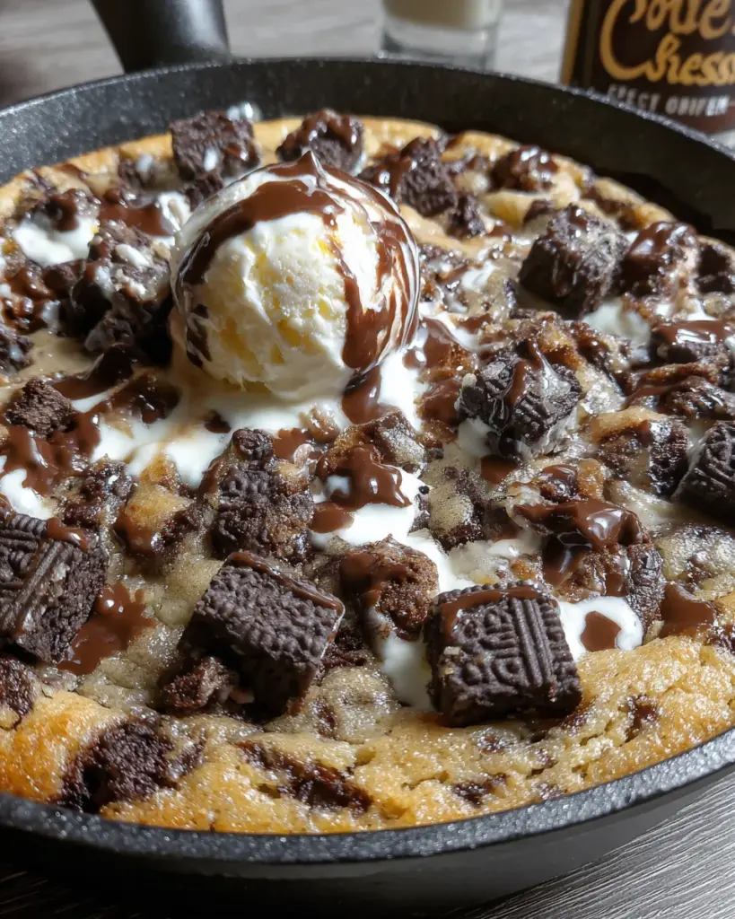 A delicious and gooey skillet cookie loaded with chocolate and Oreo bits, topped with cookies and cream ice cream.