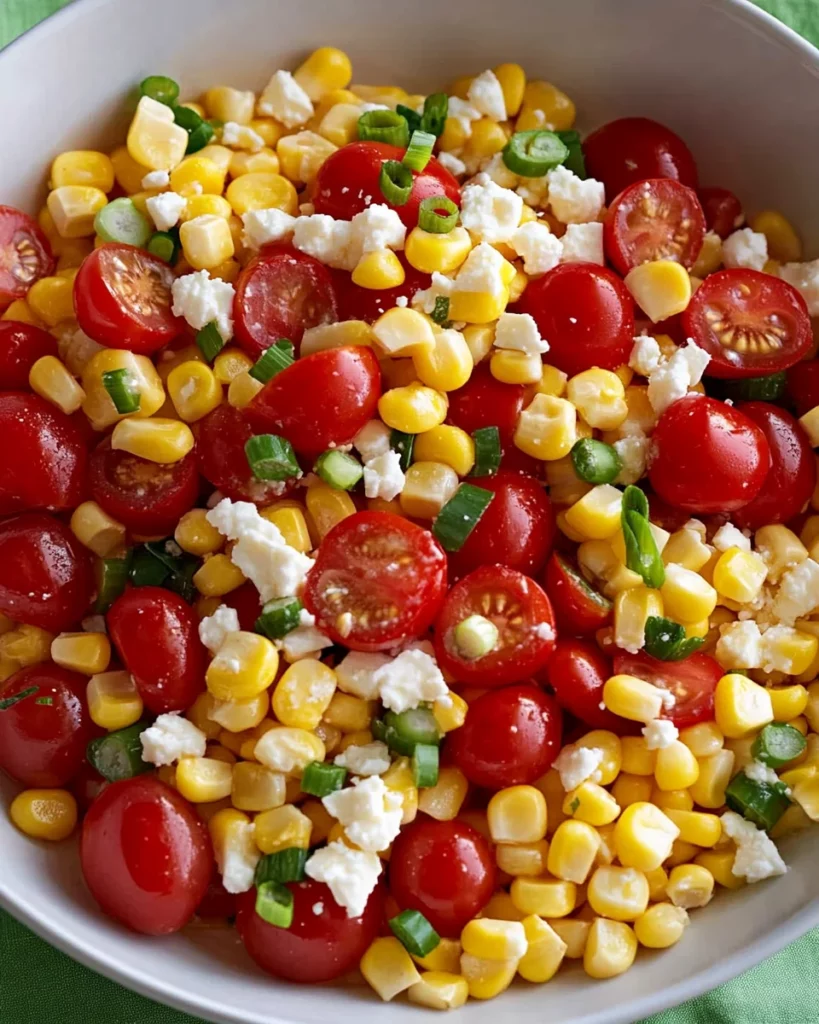 A refreshing salad featuring sweet corn, ripe tomatoes, and creamy feta cheese, perfect for summer gatherings.