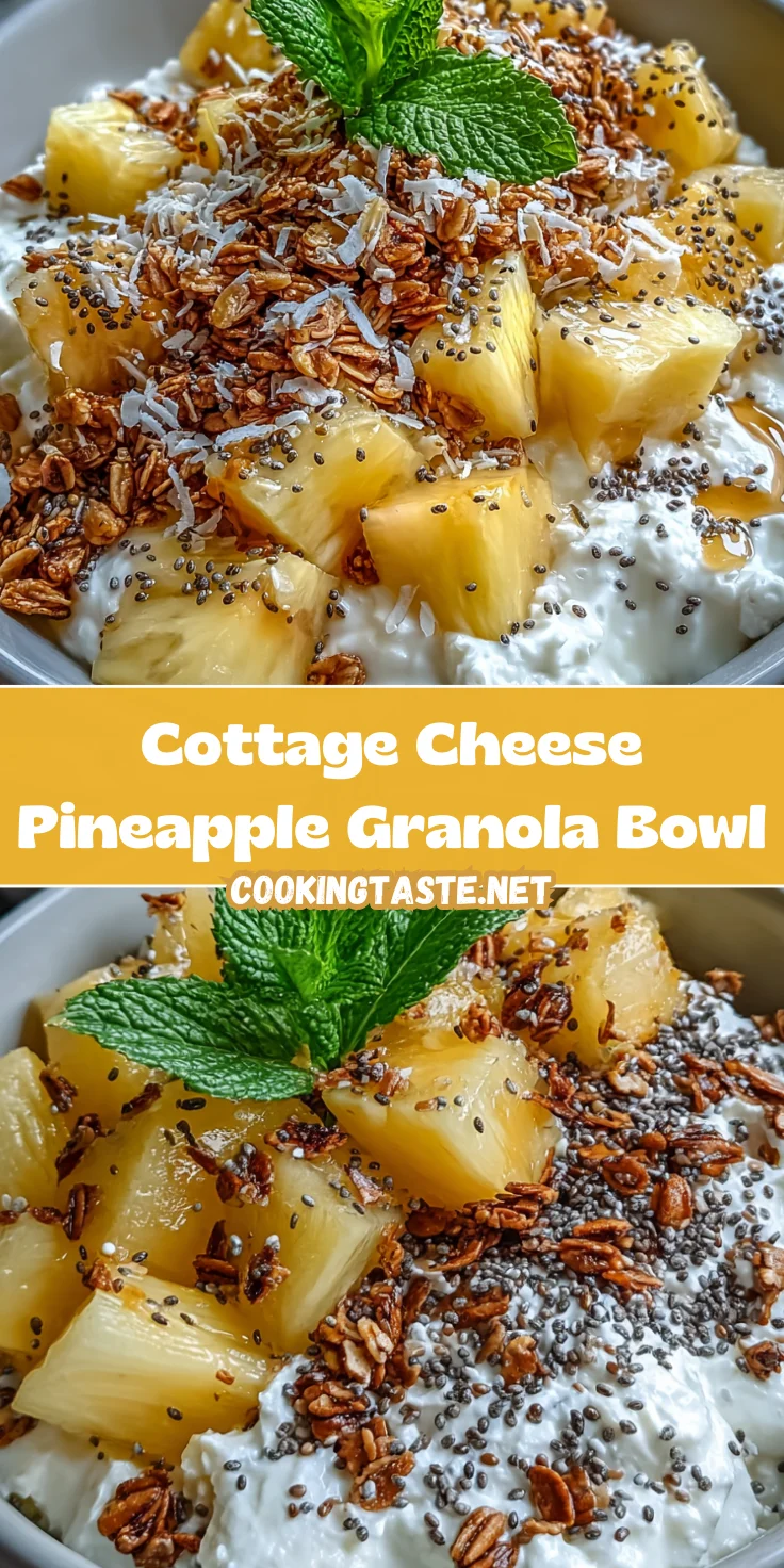 A refreshing and nutritious Cottage Cheese Pineapple Granola Bowl that combines creamy cottage cheese, sweet pineapple, crunchy granola, and optional toppings for a delightful breakfast or snack.