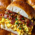 Slice the Hawaiian rolls horizontally without separating them. Place the bottom halves in your prepared baking dish. Sprinkle ¾ of the shredded cheddar cheese over the rolls, followed by a generous layer of scrambled eggs, and then the crispy bacon pieces. Finish with the remaining cheese, covering all those savory goodies. Top with the cut section of the rolls to close our flavorful treasure chest.