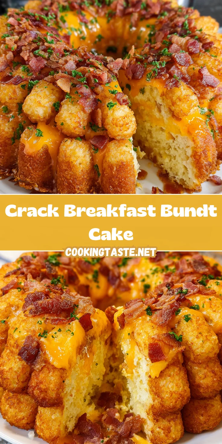 A delicious and hearty Bundt cake packed with bacon, eggs, tater tots, and cheese, perfect for starting your day.
