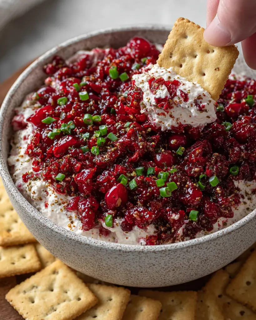 Cranberry Jalapeño Cream Cheese Dip is a flavorful appetizer that combines the tartness of fresh cranberries with the heat of jalapeño, all served on a creamy base of softened cream cheese.