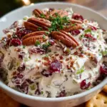 A festive and delightful cream cheese dip featuring cranberries and pecans, perfect for holiday gatherings.