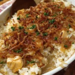 Creamy French Onion Chicken is a comforting dish featuring tender chicken and rice baked in a rich French onion soup sauce, topped with crispy French fried onions and melted Gruyere cheese.