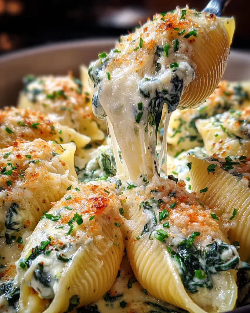 Creamy Garlic Alfredo Shells is a delicious pasta dish filled with a rich ricotta and spinach mixture, topped with creamy Alfredo sauce and melted mozzarella cheese.