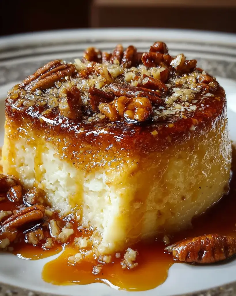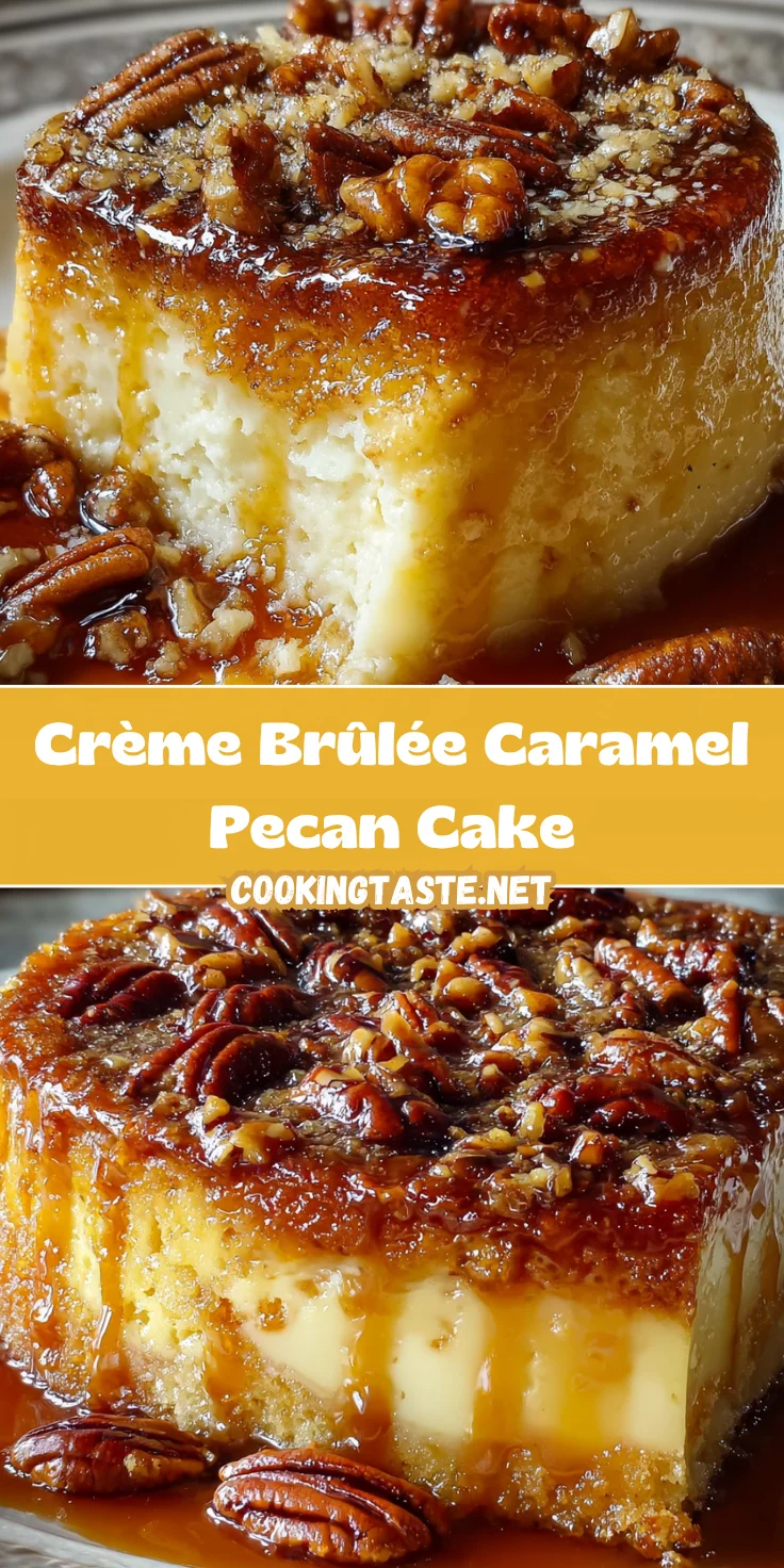 A rich and decadent Crème Brûlée Caramel Pecan Cake featuring layers of fluffy cake, creamy custard, and a luscious caramel glaze, topped with toasted pecans.