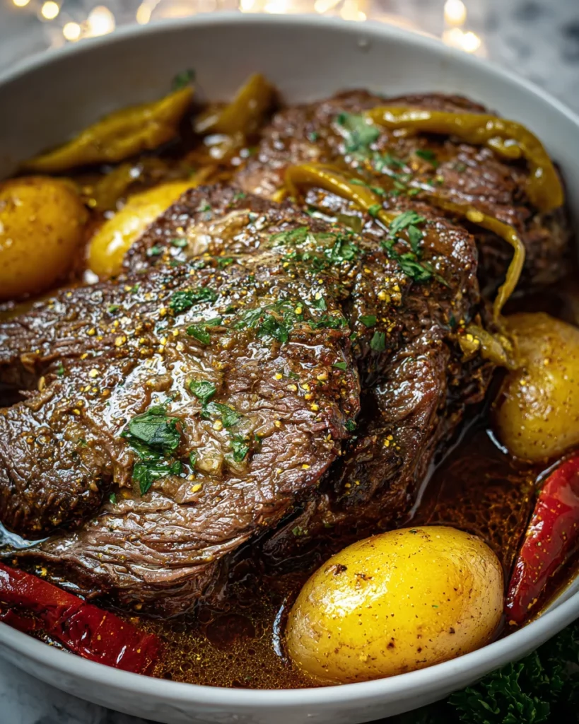 Crockpot Mississippi Pot Roast is a flavorful dish that combines tender chuck roast, tangy pepperoncini peppers, and a rich buttery sauce, perfect for family dinners.