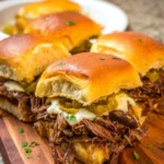 Preheat your oven to 350°F while you assemble your sliders. Begin by lightly greasing a 9×13-inch baking dish. Slice your Hawaiian rolls in half horizontally—don’t separate them yet! Lay the bottom half in your dish. Layer that with 6 slices of provolone cheese and then pile on the juicy, shredded pot roast. Finish off with the remaining cheese and some extra sliced pepperoncinis for that flavorful kick.