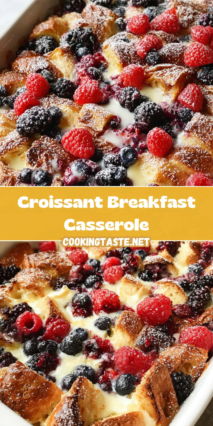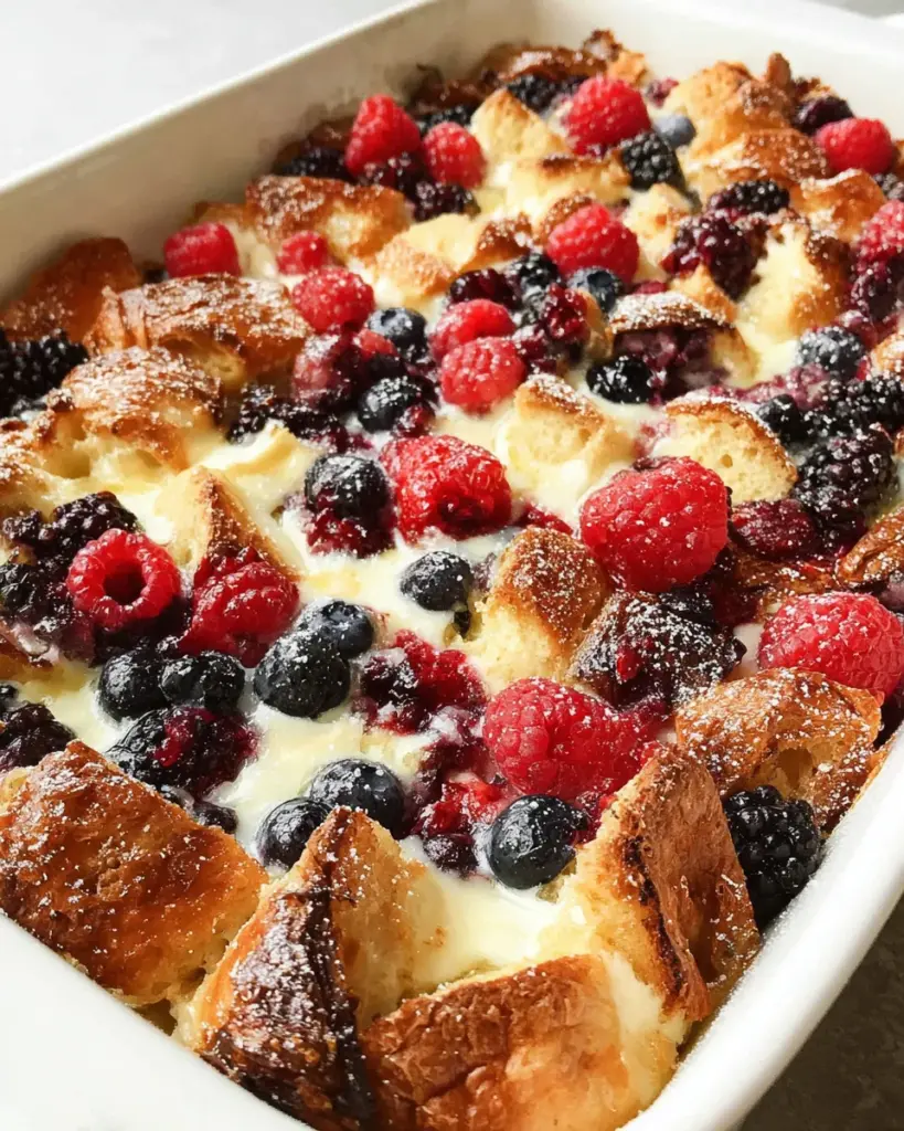 A delicious and indulgent croissant breakfast casserole featuring layers of mixed berries and a creamy custard, topped with a tangy lemon glaze. Perfect for breakfast or brunch!