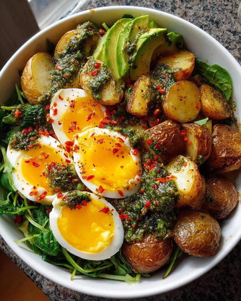 A healthy and flavorful breakfast bowl featuring eggs, roasted potatoes, spinach, and homemade basil pesto.