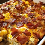 Now it’s time to build your layers! Spread the chopped everything bagels evenly across the bottom of the dish; this forms the delightful base. Next, sprinkle the crumbled bacon over the bagels, adding layers of flavor. Finally, generously top with shredded cheddar cheese. Make sure everything is evenly distributed to ensure every bite is packed with cheesy, bacon-filled goodness. Remember, it’s all about that flavor balance!