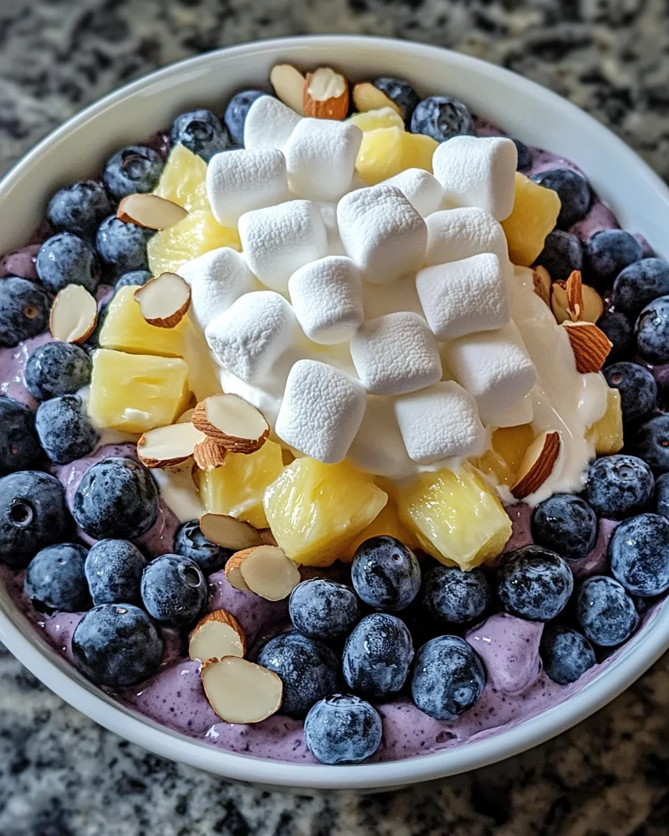 - In a large bowl, combine the blueberries, mini marshmallows, pineapple chunks, and sliced almonds.