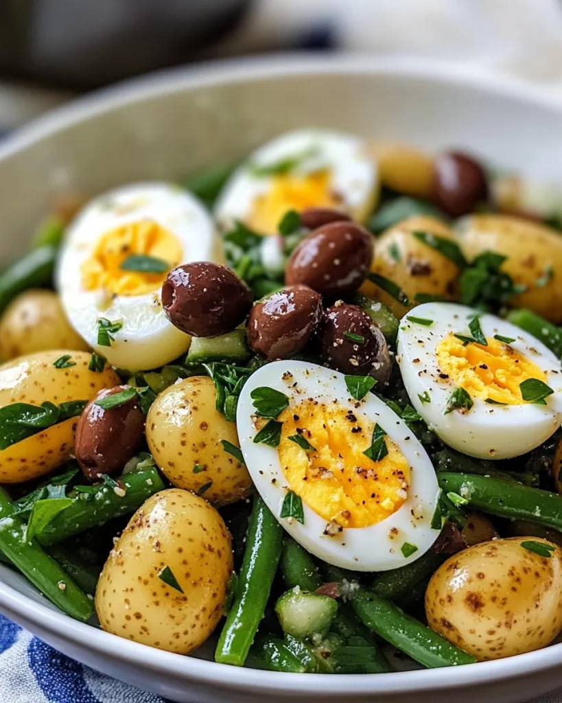 A refreshing and flavorful French-style salad made with new potatoes, green beans, hard-boiled eggs, and a zesty vinaigrette.